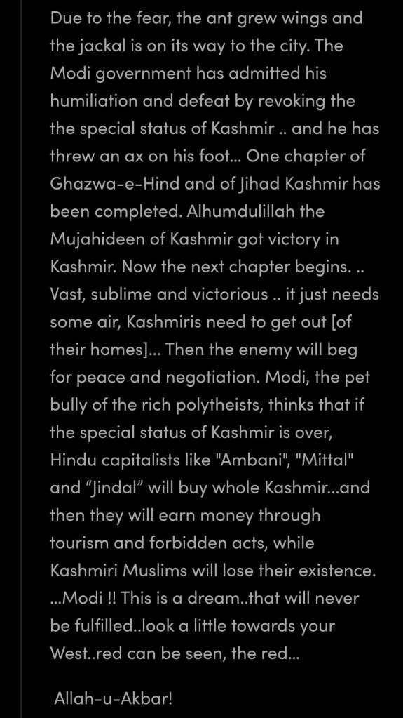Abrogation of Article 370 and consistent FATF scrutiny posed some very serious challenges to Pakistan-based terror groups, as business as usual was no longer a sustainable policy given the external pressure and falling domestic popularity, so a major workaround was crafted by these groups to operate in Kashmir without any external pressures. The biggest problem that Pakistan based terrorist organizations have Islamist identities are deeply embedded in their core, and so while their underlying objective might be to “Liberate” Kashmir however the Islamist nature of their structures and ideology makes them not only subject to massive foreign scrutiny (especially after 9/11) but also puts them consistently in contradiction with their stated aims or the recruitment materials. Furthermore, the Pakistani strategic doctrine is often to show these groups as rebels or freedom fighters; however presence of complete leadership positions in Pakistan and the inability to develop an organic/native insurgent group significantly weakens their narrative in front of the international community. However, as stated previously, Post-370, the Military-Jihadi complex found a major workaround to rectify these issues. Both JEM and LET created three specific splinter groups: TRF(The Resistance Front), PAFF(People Anti-Fascist Front), and KT(Kashmir Tigers), with TRF acting under the command of LET senior leadership(Sajjad Gul) while PAFF and KT acted under the command of JEM leadership. The move was aimed at secularizing the “Freedom Movement,” which could garner international sympathy like the PLO, and likewise, the Pakistani Leadership can exercise plausible deniability by projecting them as “Local Freedom Fighters” thereby helping them escape scrutiny.